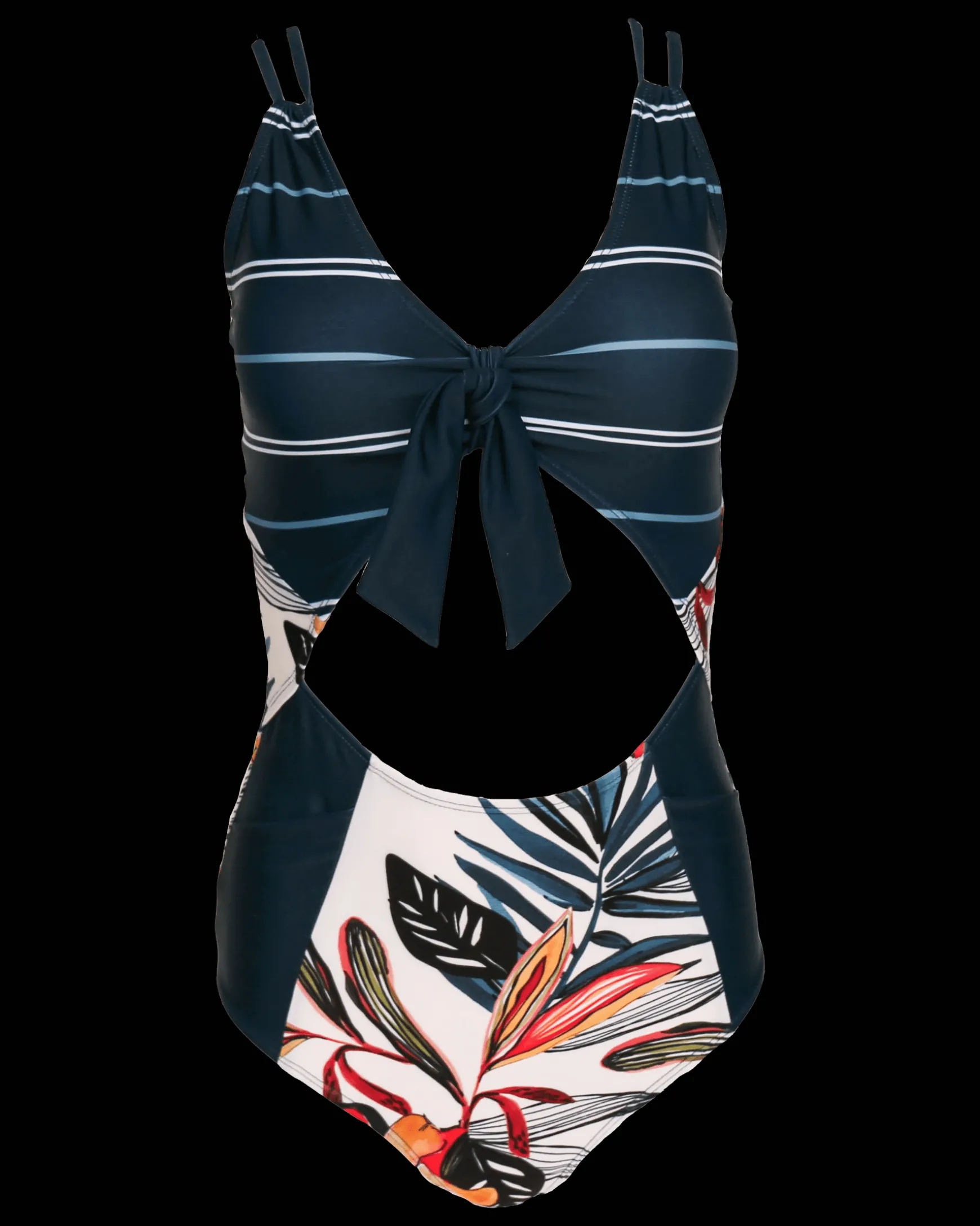 Stand out next time you hit the water in this bold mixed print fan favorite. The Rip Curve One Piece has adjustable straps to fit every height and wouldn’t be complete without the classic Nani pockets. Funky Antigua print on bottom with Navy trim and our Kai stripe print on top.