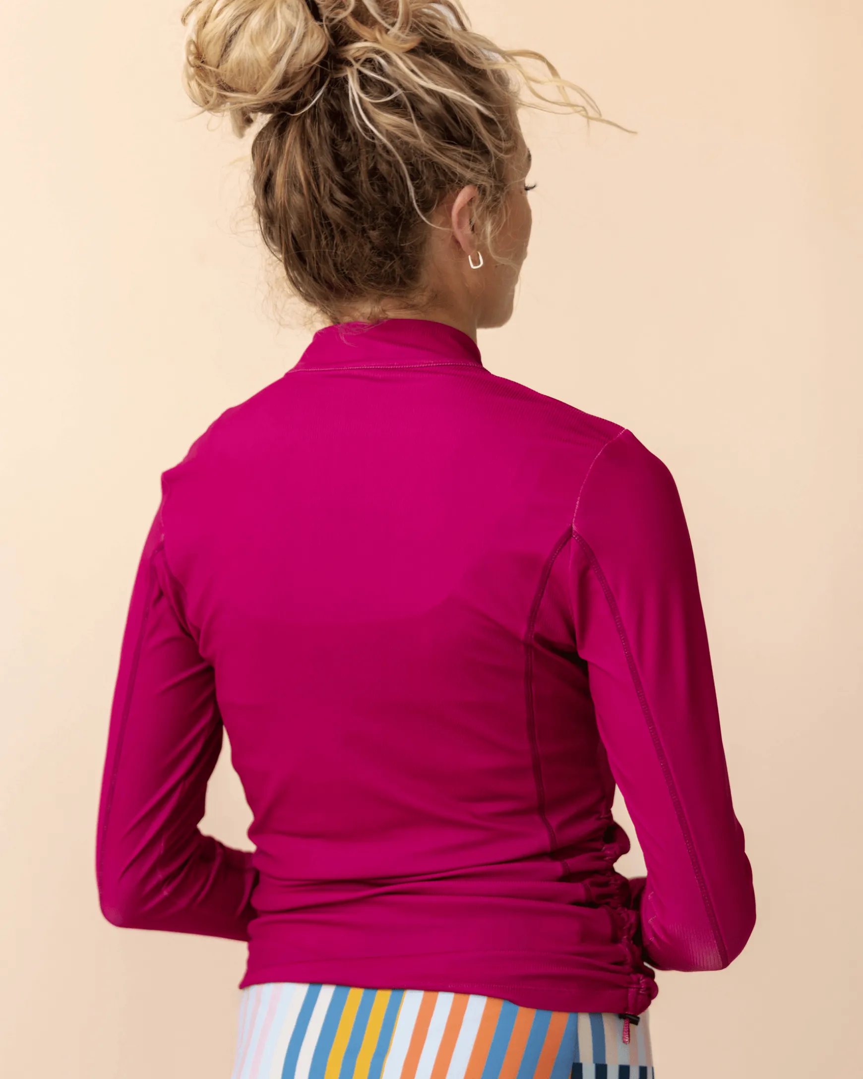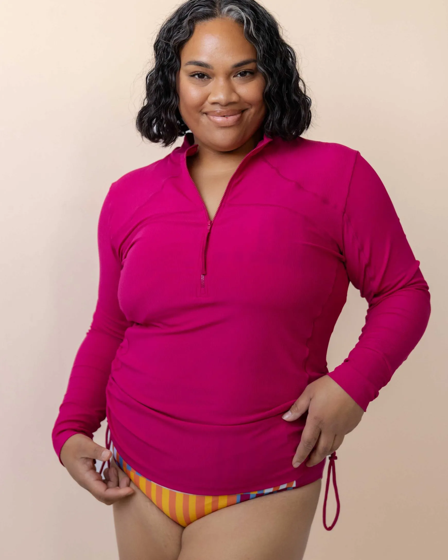 Introducing the Nani Swimwear Baywatch Rashguard. Combining cutting-edge designs and practicality, this sleek rashguard boasts a front-quarter zip for effortless wear and adjustable side ties for a personalized fit. Crafted from high-quality, quick-drying fabric, it offers superior comfort and durability. With UPF-rated fabric, it provides excellent sun protection. Embrace versatility and easy care with this must-have addition to your swimwear collection.