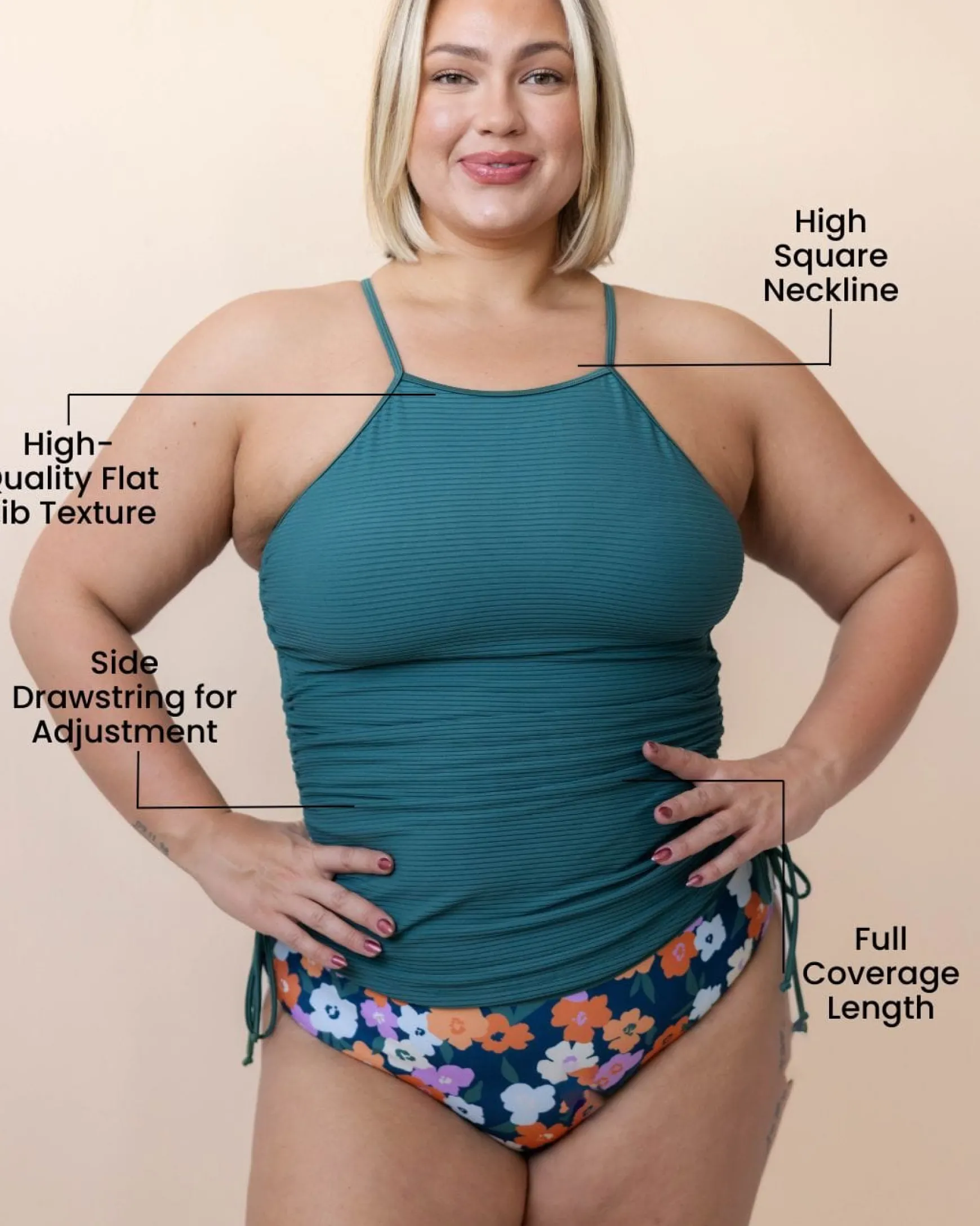 Where coverage meets comfort, meet the Drawstring Tankini. Flattering side ruching for an adjustable length. Adjustable straps and a high neck for active comfort.