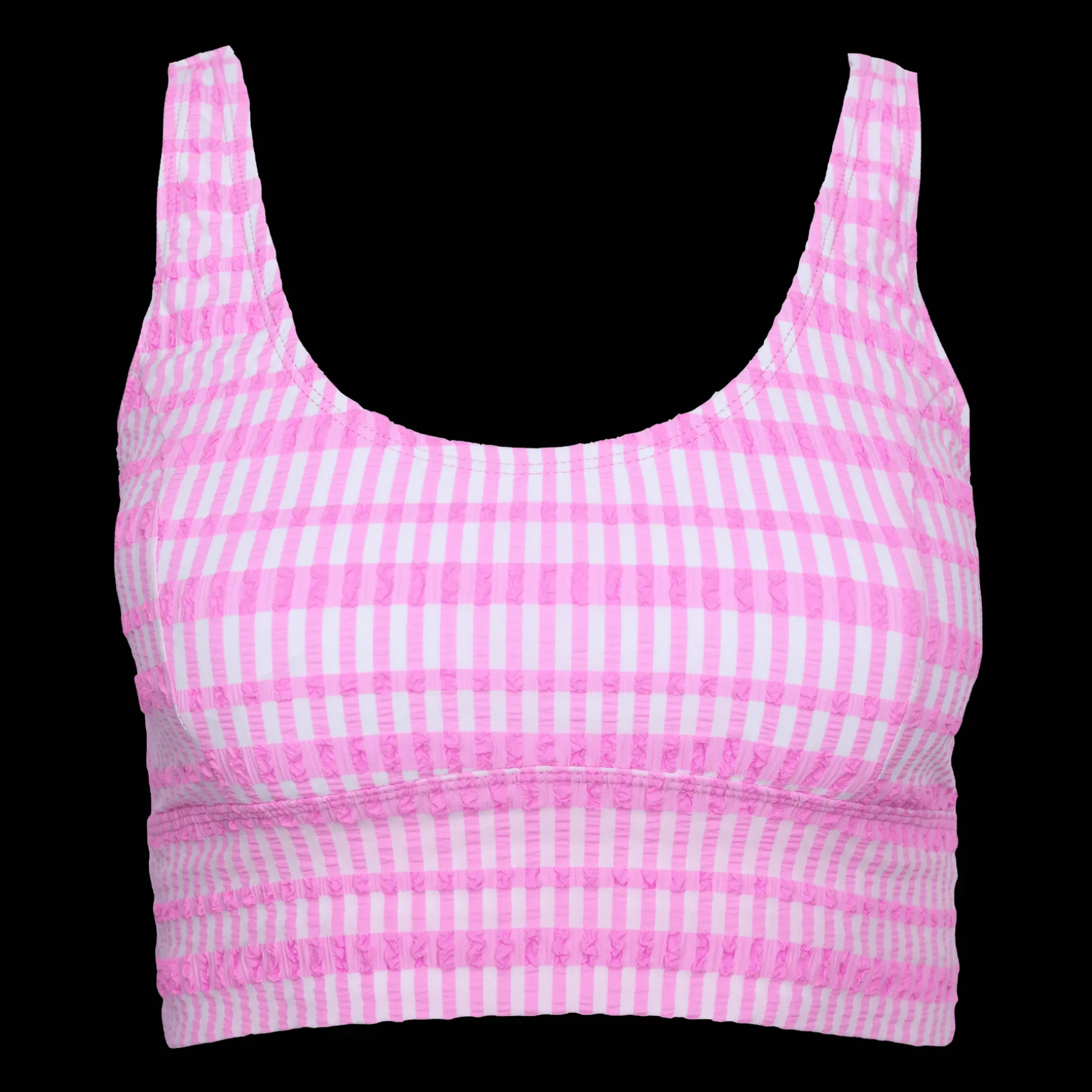 Stay covered, comfortable, and worry-free as you dive into any and all of your water activities. Our all-new Avant Crop is made with three-dimensional textured gingham fabric in a modern bright pink and white check that will show off your spunky personality.